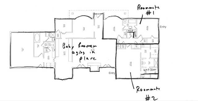 In this case the existing house is being renovated to a high standard and will ultimately contain three luxury master bedroom suites. Each will boast premium amenities like a private bath, upscale wet bar, and separate door out to the spacious garden, pool, and barbecue. The property is already graced by ample parking for multiple vehicles. This is absolutely, definitely, for sure, hand-on-heart NOT a de facto three unit apartment building. No ma’am. He’s just planning on living in this house and taking on a couple of roommates.