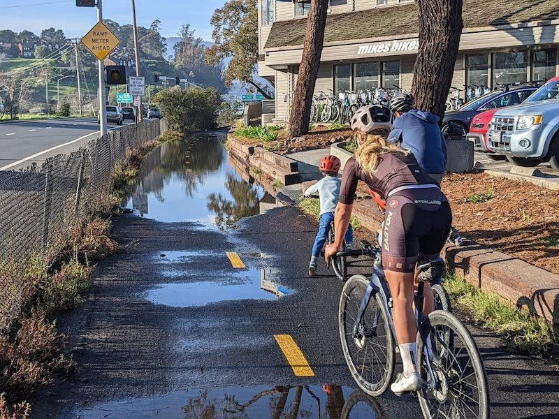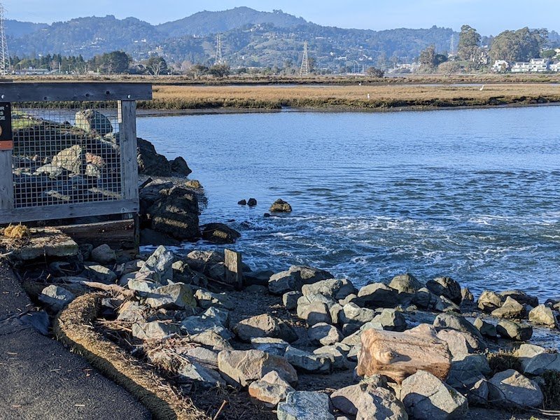 One of the little things you notice on a bike or on foot that you might not even be aware of in a car at 60 miles per hour is the king tide. It hadn’t rained for weeks, yet there was standing water in places that shouldn’t be wet. Low lying territory is subject to sunny day floods when the sea comes up in these naturally occurring super tides. You also notice how the roadway for cars and trucks remains dry, but the bike path is a foot deep in swamp water. Then there’s the electrical substations, sewerage treatment plants, airports, and all sorts of other critical infrastructure sitting there in the marshland. If the tides ever get a little too high a bit too often they’re all in trouble. I don’t see anyone lining up to pay to fortify or relocate this stuff, although there’s plenty of bickering all around. In the end, the water always wins.