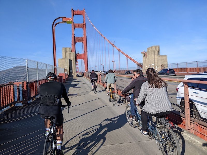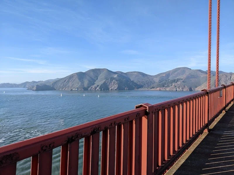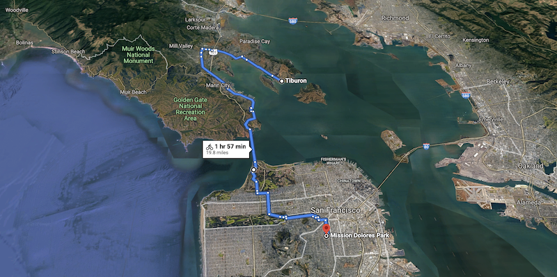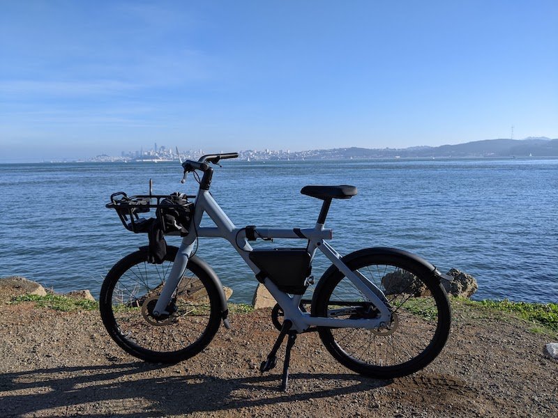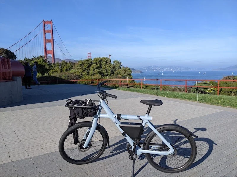 For her maiden voyage I took Muffy Van Moof out to Tiburon to the north of the city to test the battery range. My route went through my neighborhood near Dolores Park, along the Wiggle to Golden Gate Park, then across the Richmond District to the Golden Gate Bridge to Marin County. From there it was a mostly straight shot from Sausalito to Tiburon along the designated bike trail that hugs the waterfront.