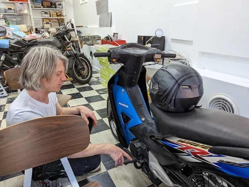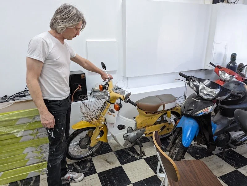 He currently lives in a long defunct shopfront that he’s scrubbed clean, painted, organized and strategically upgraded. He fitted the back office with a kitchen (minus a stove) with second hand fixtures and appliances he scavenged for cheap. For something that only cost a few hundred dollars I think it looks quit respectable. I especially love the way he fitted mirrors to the fridge to transform it from a scratch and dent unit to something with a bit of sparkle.