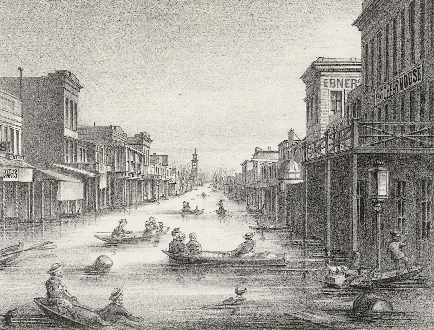 One of the lesser known aspects of Sacramento’s location and history involves serious cyclical floods. The same geography that provides navigable waterways for commerce and fresh water for agriculture also delivers devastating periods of inundation. The Great Flood of 1861 submerged a 300 mile (480 km) long stretch of California’s Central Valley and bankrupted the young state.